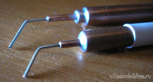 После остывания пайки берём иглу от шприца, длинной 18мм, вставляем в неё отрезок провода или проволоки (как оправку) и сгибаем край иглы под угол 45 градусов на расстоянии от края 8мм. Зачищаем иглу наждачной бумагой и вставляем её в 2мм трубку, на глубину 5мм. Тоже запаиваем и все места пайки после остывания зачищаем до блеск.