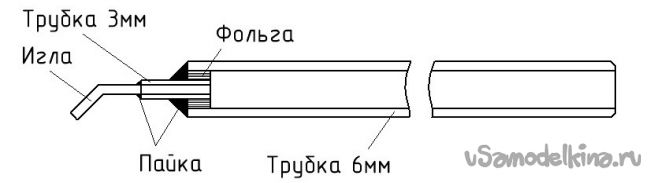 Первое что необходимо сделать, это обрезать все трубки нужной нам длины. Так как все элементы инструмента будут спаиваться паяльником между собой, необходимо тщательно зачистить все места пайки. Конструкция схематически выглядит так: