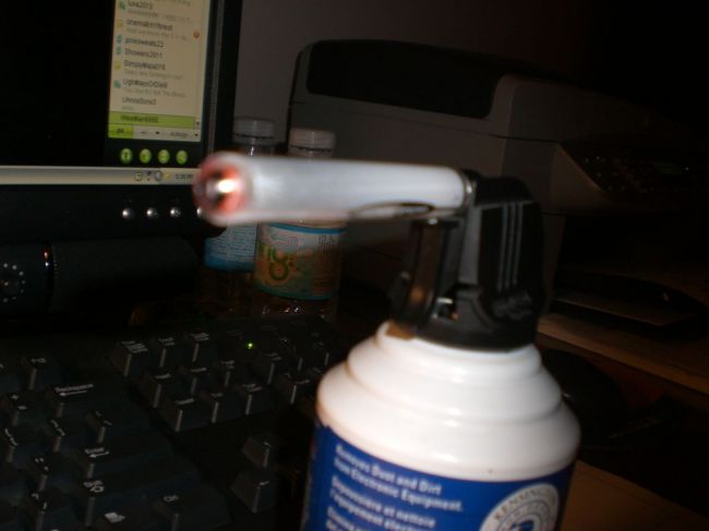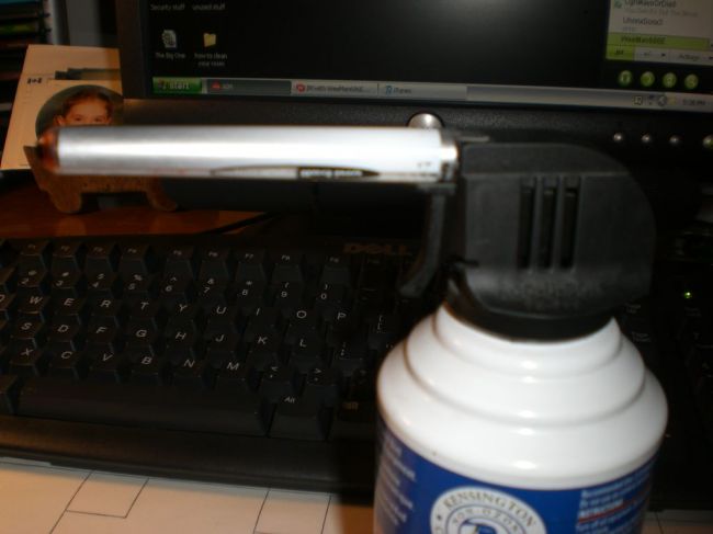 Сперва автор этого урока занялся сборкой самого баллончика. Для этого надо вытащить из ручки стержень, разместить его внутри пластмассовой трубочки. Далее извлеките из баллона со сжатым воздухом продолговатую часть, расположенную у клапана.
