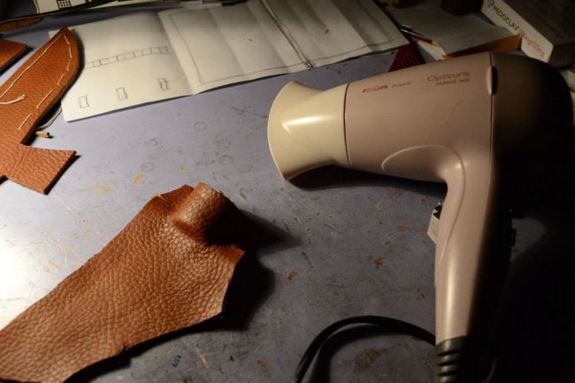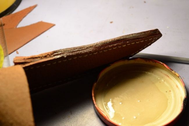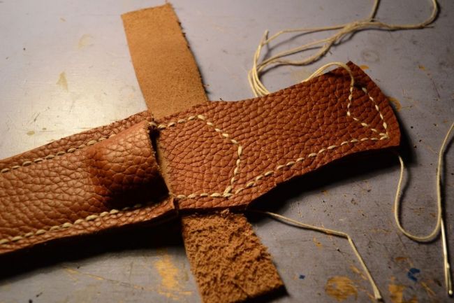 Шаг 9: Приклеиваем кусок кожи двухсторонним скотчем и прошиваем вощеной нитью.