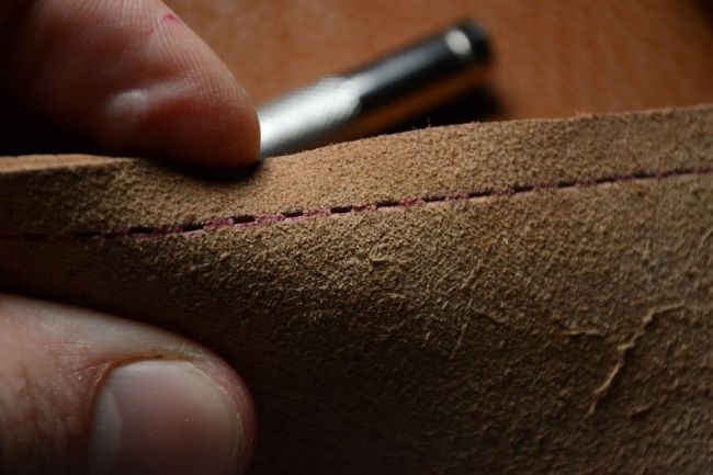 Шаг 7: С помощью вощеной нитью полностью прошиваем чехол ножа. Лишнее срезаем.