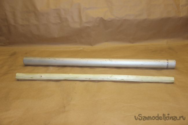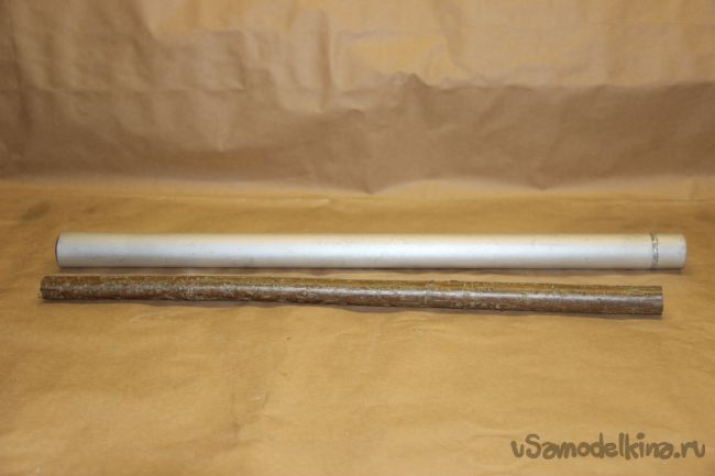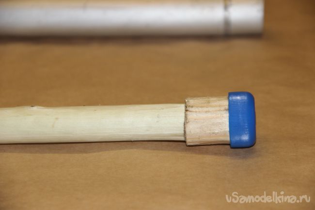 Шаг 3: Далее нам нужно найти палочку. Длина палки должна быть меньше трубки на столько, сколько составляет длина крышки, которую мы делали ранее. Диаметр палки должен быть почти в два раза меньше диаметра трубки.