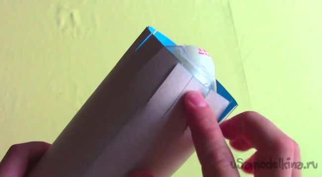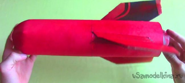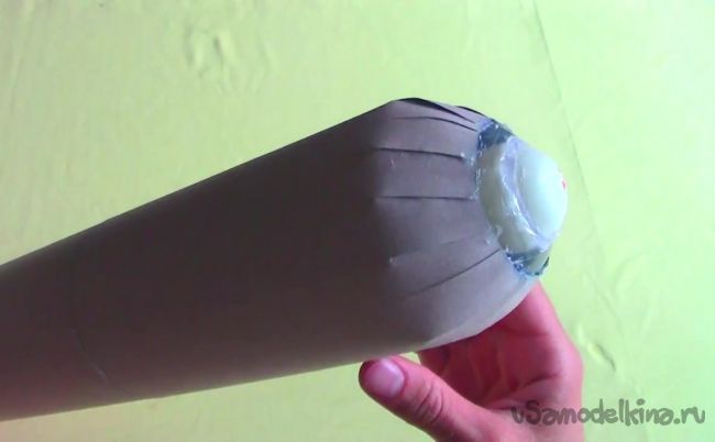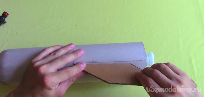 Делаем надрезы на картоне в верхней части будущей ракеты и сглаживаем их вдоль бутылки с помощью клея.