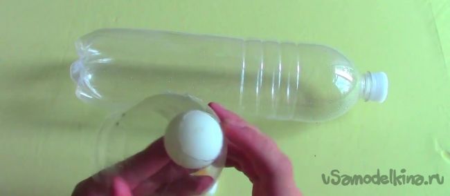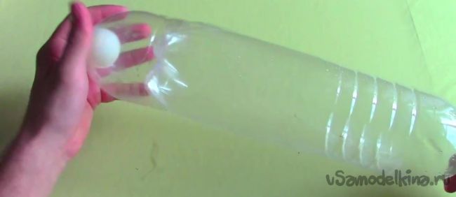 В маленьком отверстии, оставшимся после вырезания горлышка приклеиваем шарик для настольного тенниса. Шарик в этом случае будет выполнять роль верхнего обтекателя ракеты.