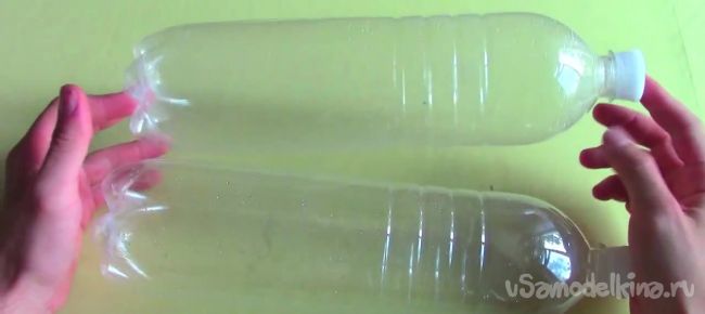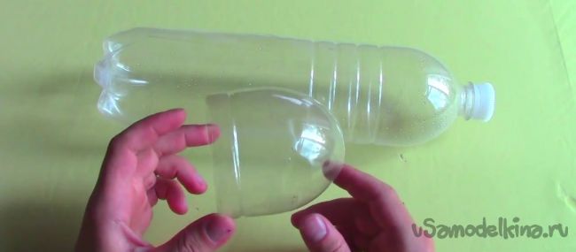 С одной из пластиковых бутылок необходимо вырезать верхнюю часть, чтобы получить заготовку, похожую на ту, которая представлена на рисунке ниже.