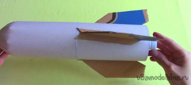 Далее берем листы альбомного картона и обматываем их вокруг будущей ракеты.