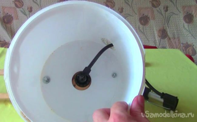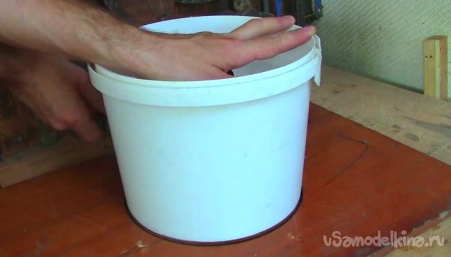 Далее нужно позаботиться о спусковой платформе. Для этого берем ведерко о деревянную доску.