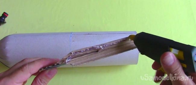 При помощи клеевого пистолета фиксируем стабилизаторы в нижней части ракеты.