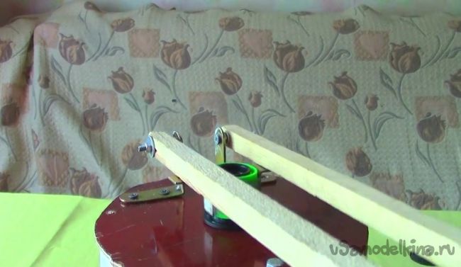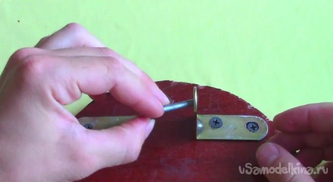 Далее крепим уголки у края круглой доски и крепим две деревянные планки при помощи болтов.