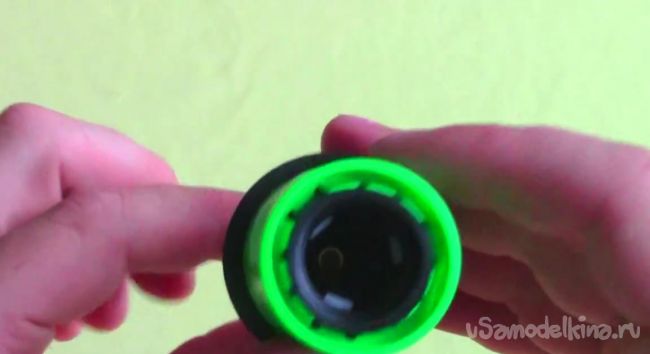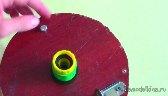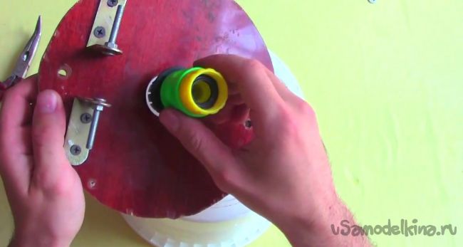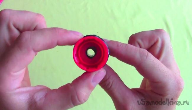 Далее берем крышку от бутылки и проделываем отверстие по диаметру отверстия в переходнике.