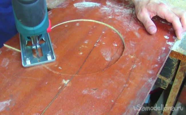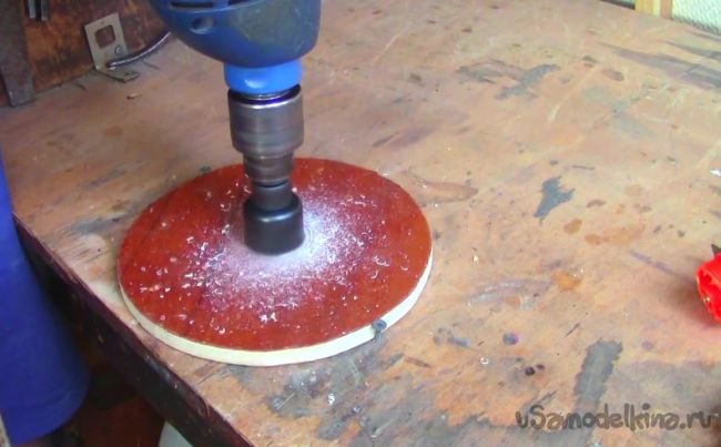 Проделываем посередине деревянного круга отверстие по диаметру быстрого соединителя.