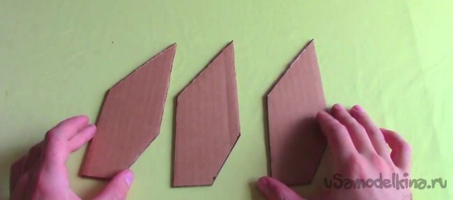 Следующим шагом необходимо позаботиться о стабилизаторе для ракеты. Для этого берем картон потолще и вырезаем из него заготовки по форме тех, которые можно увидеть на изображении ниже. Таких заготовок нужно три.