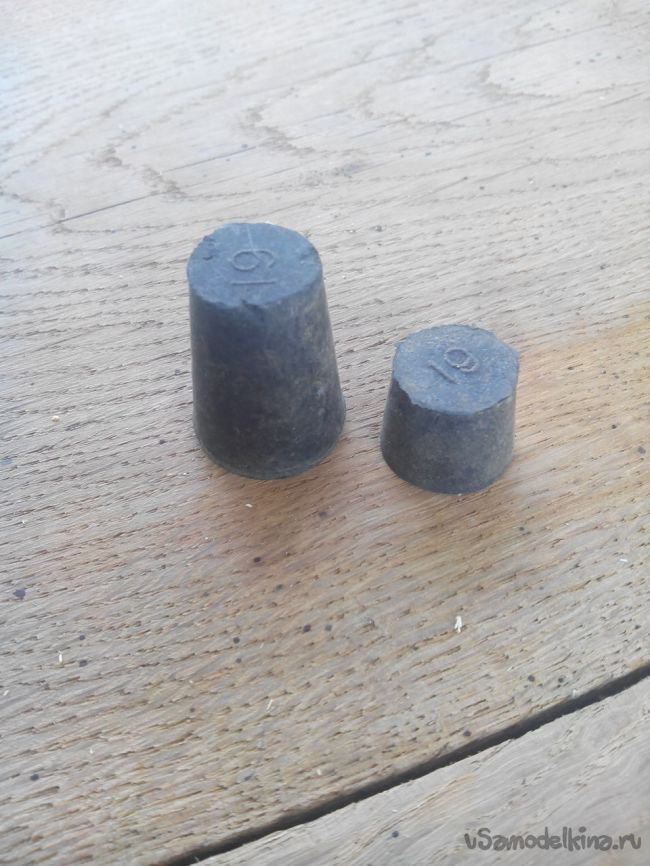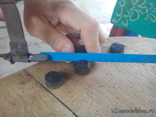 Распиливаем резиновые пробки,взятые из химических пробирок ножовкой по металлу, делаем их толщину одинаковой при помощи наждачки, если отпилить ровно не удалось.