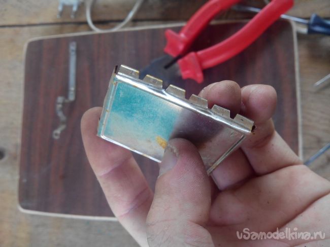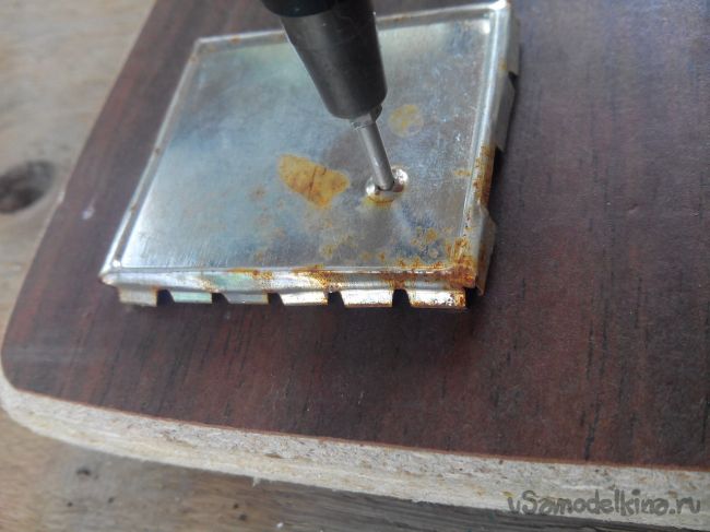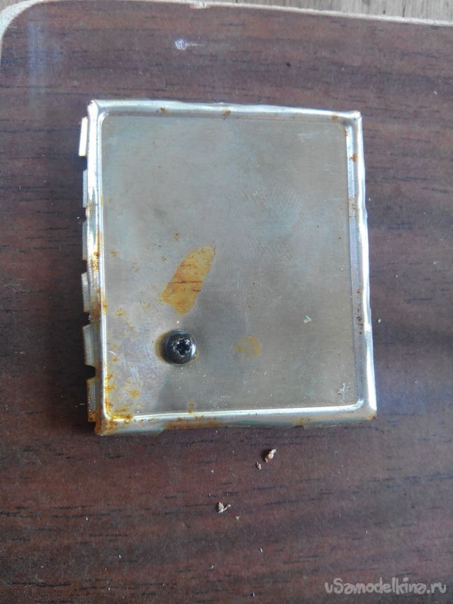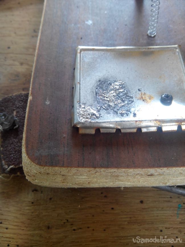 Я пробил в пластинке, которую достал из радиоприемника, дырку и в нее закрутил болт, он надежно прижал ее к подставке.