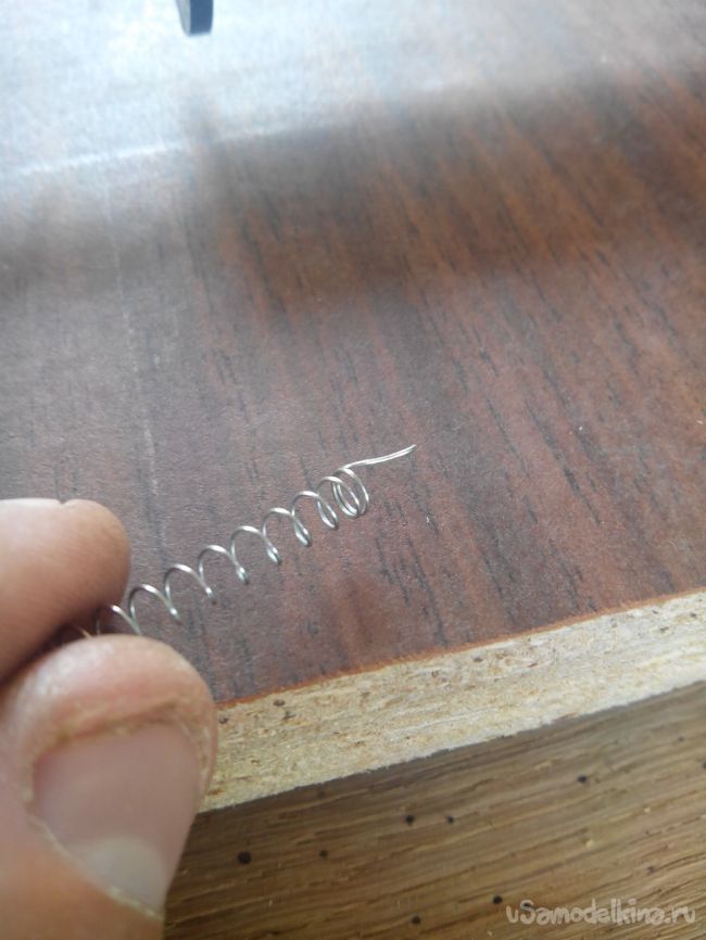 Из шариковой ручки, которая как раз уже закончилась я снял пружинку и решил поставить на наш крючок, сначала загнул один ее конец, затем проделал дырку отверткой в доске подставки и запустил туда этот конец пружины, а наверху припаял ее к крючку.