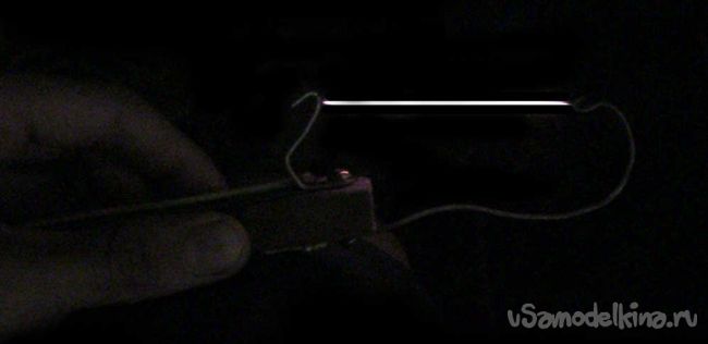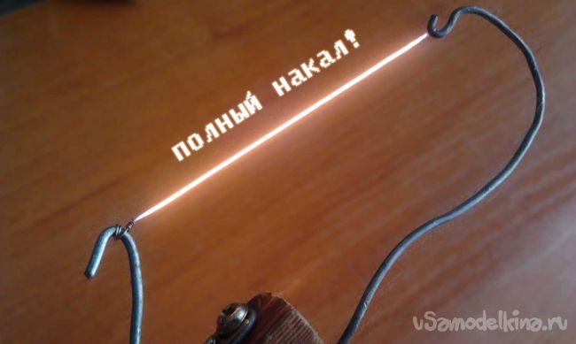 Вы можете придать своему резаку любую удобную вам форму. У меня получилось что-то вроде греющегося ножика-пилы. Толстая проволока при этом почти не нагревается из-за своего маленького сопротивление, а режущая наоборот – хорошо греется. Если я подключаю маломощный блок питания, то нить просто нагревается, а если беру мощный трансформатор, то нихромовая нить просто разжаривается до красна, выглядит классно (в темноте светит очень ярко, прям как лампа накаливания!), но такая высокая температура просто мне не требуется.