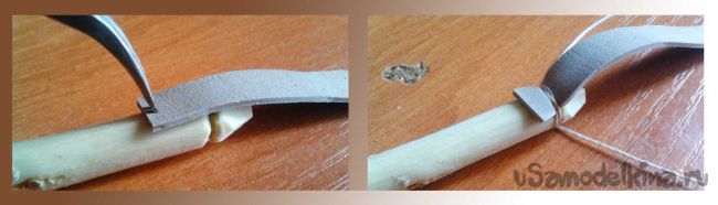 Приступим к закреплению на дугу лука тетивы. Предварительно ножиком делаем посадочные места для того чтобы лучше закрепить резину.
