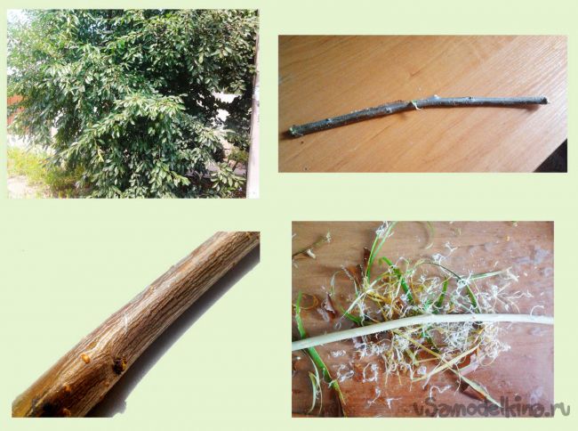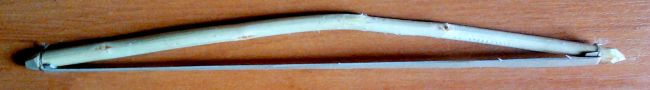 Размеры лука будут очень малы, примерно, как ладошка взрослого человека. Основную часть делаем из любого дерева, которое вам доступно и его ветвь подходит по форме. Мною была выбрана вишня, на дереве, которой я нашёл и отрезал ветвь примерно одной толщины с небольшим изгибом. Несмотря на то, что используемая палочка имеет маленький диаметр, она легко выдерживает нагрузки за счет своей гибкости. Для лучшей эстетики удаляем кору и лук делается белоснежным.