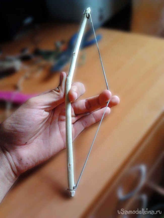 Мы же сделаем лук, которые будет работать немного иначе (примерно, как рогатка). Запасаться энергия от натягивания тетивы-резины будет прямо в ней же, а деревянная основа останется не сгибаема.