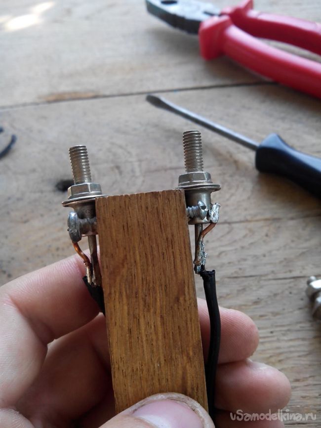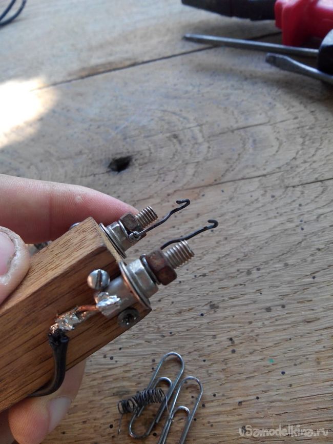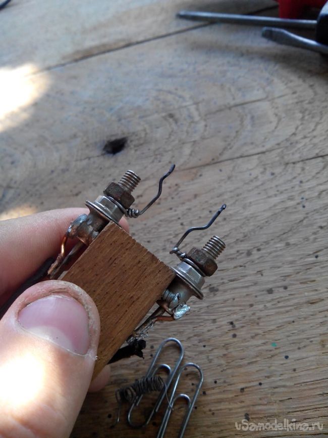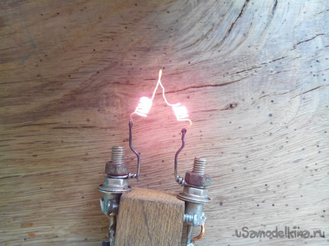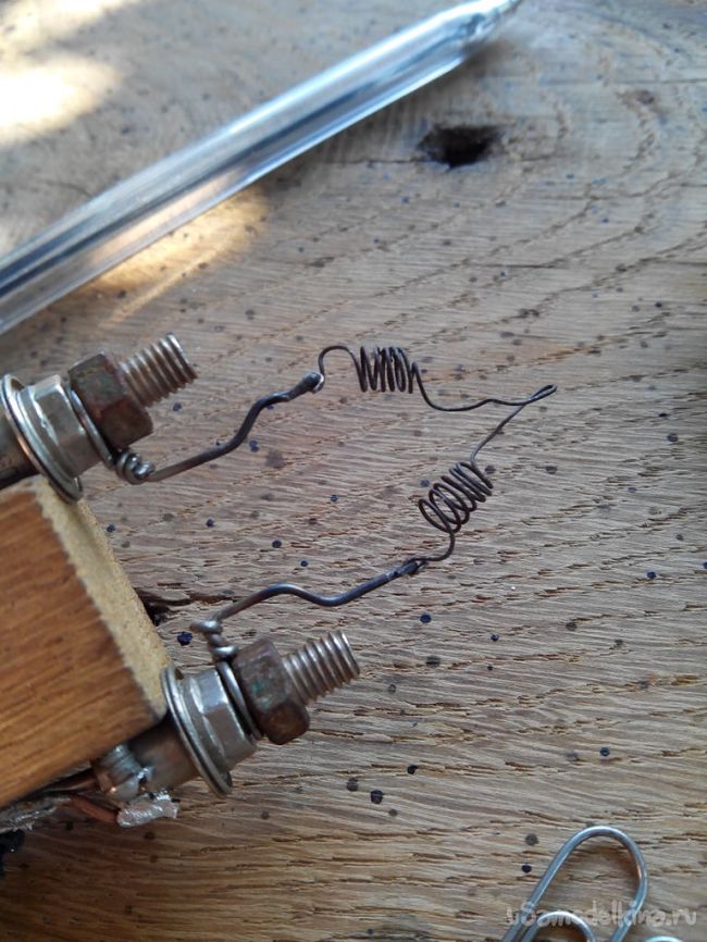 Сбоку видно, что крючки под нашу нить накала уже готовы, поэтому следующий этап будет зажимание их на крючках.