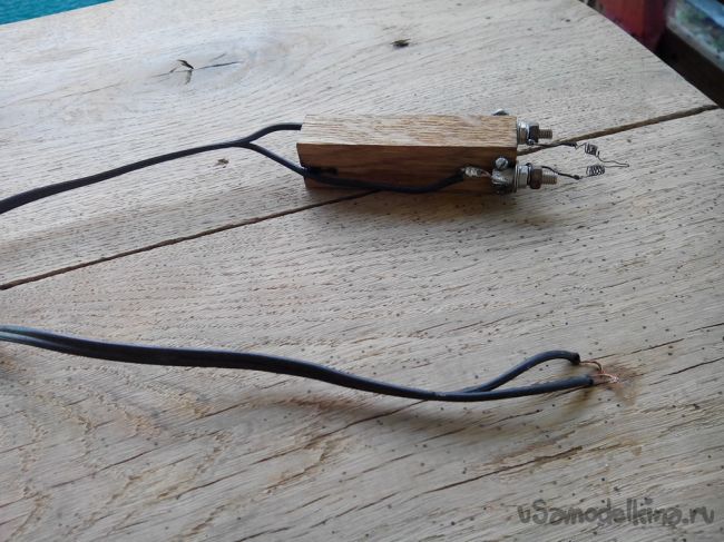 Далее припаиваем два провода к диодам, выбираем провода потолще, сечением в 2 мм, как минимум, так как при использования выжигателя провода будут перегреваться, что не очень то и хорошо.