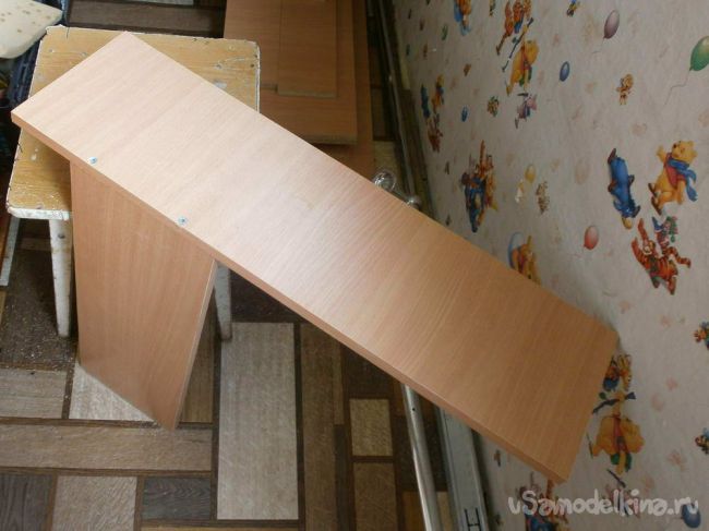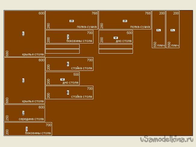 Строить его мы будем из ламинированной ДСП, а значит, всё начинается с её раскроя. Целый лист нам не нужен, реально весь стол занимает даже меньше половины. А значит – либо его хватит ещё для каких-то некрупных элементов корпусной мебели, либо – сразу на два складных стола.