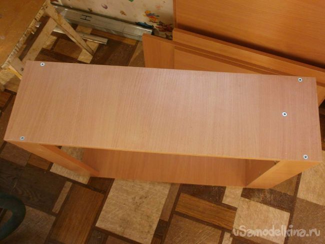 Делаем «фундамент» для нашего складного стола. К основанию будущей «табуреточки», прикручиваем шестью конфирматами (по три на сторону), порожки. Всё, готово.