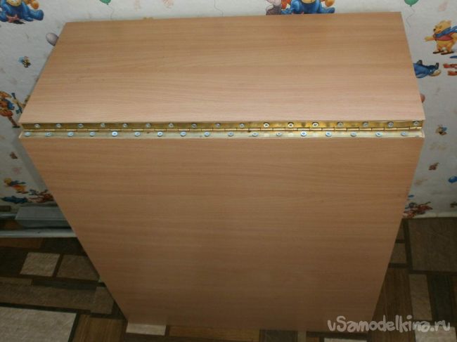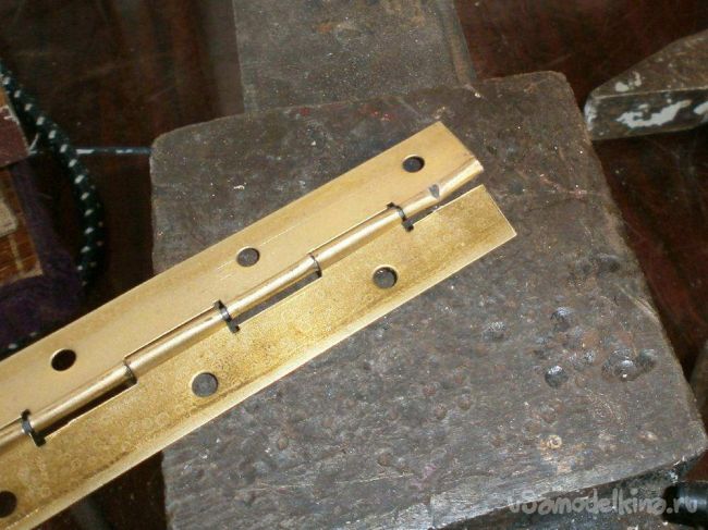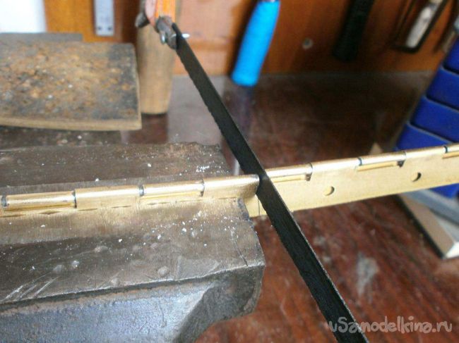 Теперь рояльная петля. Её нужно разрезать, убрать с краёв образовавшиеся заусенцы.
