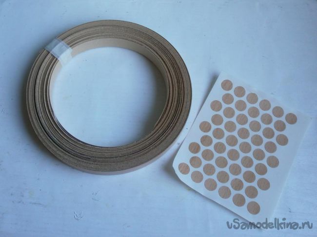 • 15 метров бумажной кромки (можно было сразу заказать поклейку вместе с распилом, но я не сделал этого) + кружки-самоклейки для головок конфирматов,