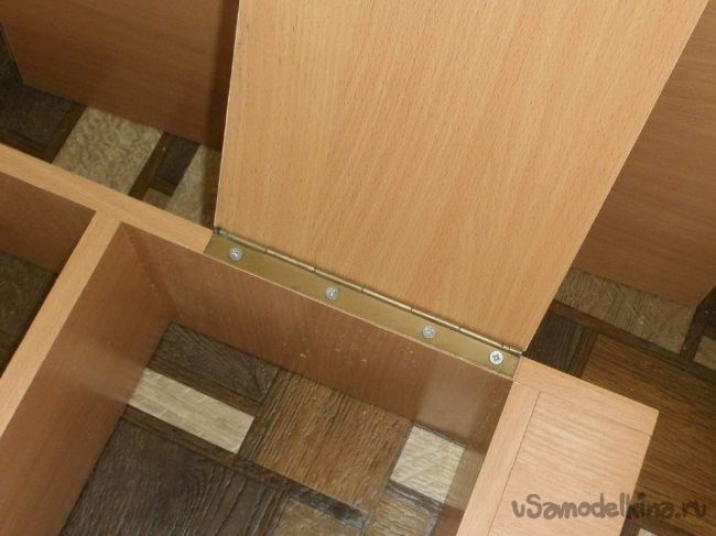 Но они должны быть подвижными. Поэтому длинными саморезами прикручиваем короткие рояльные петли сначала к ним,