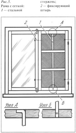 При наступлении сезона комаров в кухонном окне я снимаю с петель одну створку оконного блока и на ее место ставлю раму с сеткой (рис.5). Рама связана из деревянных брусков сечением 40 х 30 мм. Сверху вниз посредине рамы сквозь бруски перекладин пропущен стальной стержень диаметром 5...8 мм. Этот стержень является предохранителем от ночных двуногих непрошеных гостей — татей, для которых сетка не преграда. В проеме окна рама фиксируется проволочными штырями или большими гвоздями, которые свободно входят в соответствующие отверстия в раме и в оконной коробке.