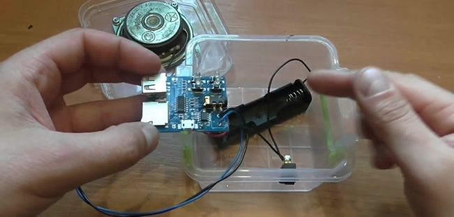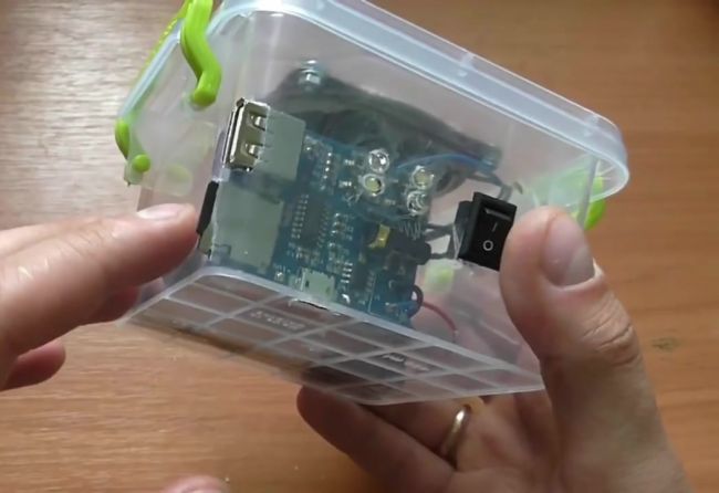 Наш портативный плеер готов. Осталось вставить аккумулятор в коробочку, вставить карту памяти с любимыми музыкальными композициями и насладиться результатом проделанной работы. Отметим, что при отсутствии аккумулятора, питание платы можно обеспечить обычным зарядным устройством Micro USB.