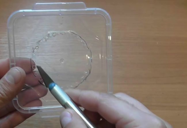 Далее сверлом маленького диаметра просверливаем по контуру круглой линии кольца динамика. Берем макетный нож и вырезаем полученный круг без каких-либо проблем.