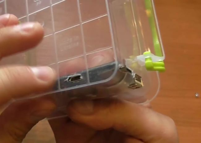 Кладем плату верхней частью к боковой стенке емкости и отмечаем места вырезов для USB коннектора, а также разъема карты памяти и кнопок.