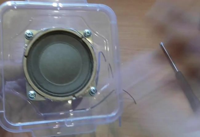 Теперь необходимо прикрутить динамик на крышке емкости четырьмя болтами.