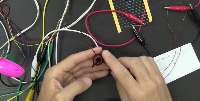Далее берем ферритовое кольцо, которое по словам автора идеи, можно приобрести за 20-30 рублей, и медный провод толщиной 0.5 – 0.8 мм. Следует учесть, что при использовании провода меньшей толщины, передаваемые звук будет некачественным. На ферритовом кольце нужно намотать две обмотки. Первичная обмотка должна состоять из 20 витков, а вторичная – из 35 витков. Отметим, что при желании можно намотать больше витков, особенно на вторичной обмотке.