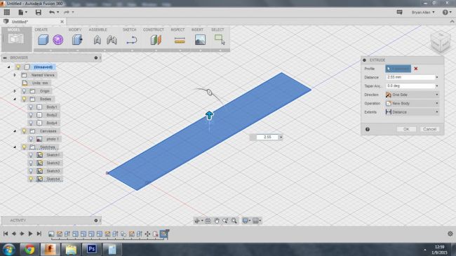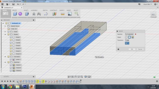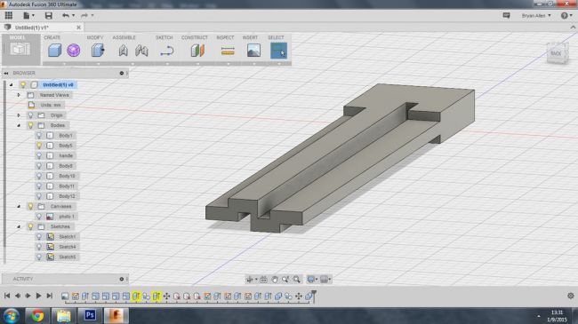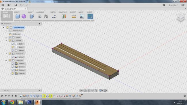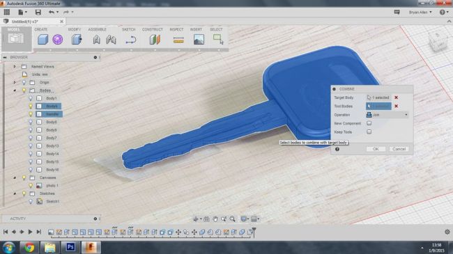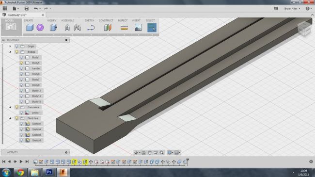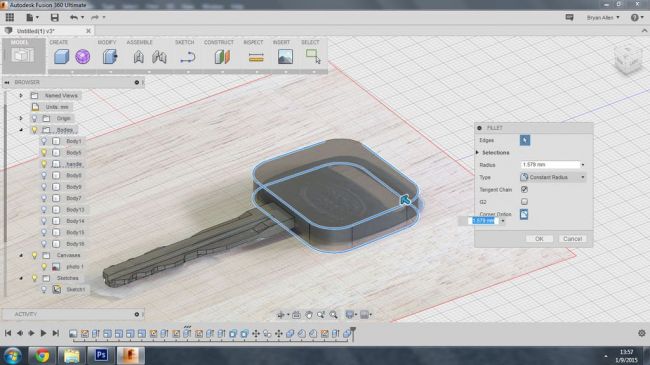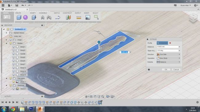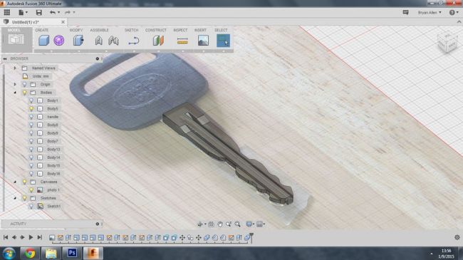 Теперь в программе нужно указать, где проходят канавки ключа и какой они глубины. При этом измерения должны быть максимально точными, иначе ключ может не сработать. Канавки создаются в эскизе 2D. У автора ключ имел канавки с обеих сторон, поэтому созданное изображение необходимо было скопировать, а затем развернуть по центральной кнопке. После объединения изображения можно приступать к вырезанию канавок. Чтобы ключ был прочнее, на его конце нужно сделать фаски.