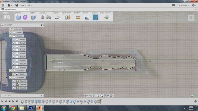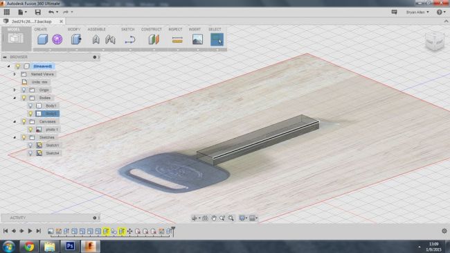 Теперь нужно взять штангенциркуль и максимально точно измерить ключ. Далее на основе этих цифр в программе Fusion 360 необходимо сделать масштабирование картинки. Эскиз ключа должен быть в виде прямоугольника, при этом ширина сторон такого прямоугольника должна определяться самым широким местом, которое имеет ключ. При желании на этом этапе можно также сразу добавить и головку ключа.