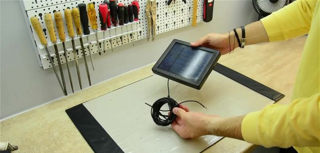 Разбираем солнечную панель. Помимо самой панели в корпусе находится микросхема, из которой выходят два провода. Она отключает аккумулятор от панели, когда последней не хватает света для зарядки аккумулятора.