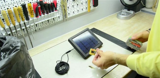 Подсветка готова. Остается прикрепить солнечную панель. Во время дождя панель можно прикрыть полиэтиленовым пакетом.