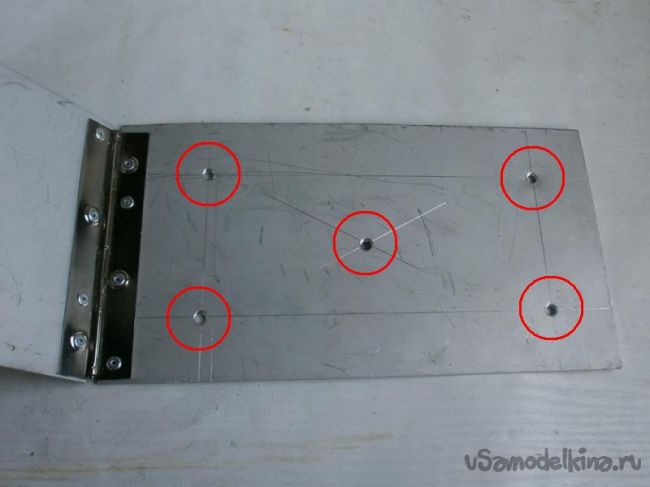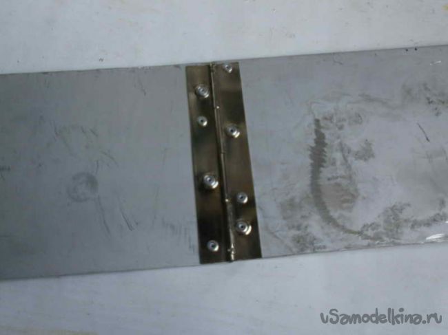 Лист алюминия разрезаем на три детали (две – 140 на 240 и одна – 140 на 280), а рояльные петли на два фрагмента по 135 мм. Обязательно в двух местах по краям, резким ударом молотком и зубилом, фиксируем внутренний стержень относительно рубашки, чтобы он никогда не выпал. Приклёпываем рояльные петли (нужно просверлить дополнительные отверстия в них самих), соединяя сначала две детали,