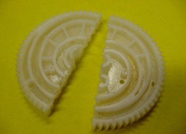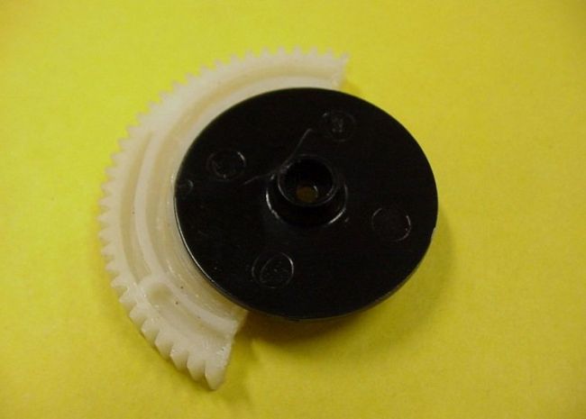 Нужно взять пластиковую шестерню и разрезать ее на две одинаковых части. Затем нужно снять рожок и с помощью клея закрепить его к одному полукругу.