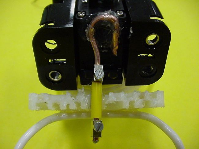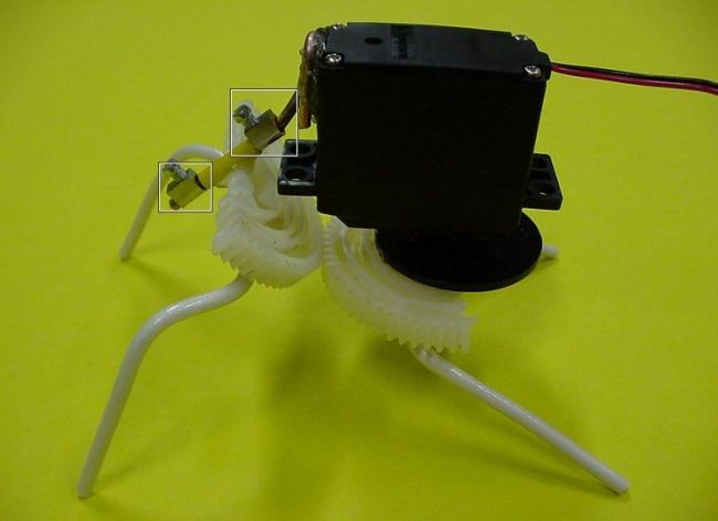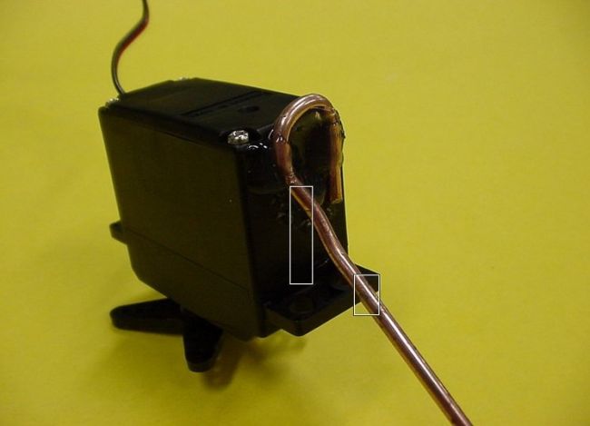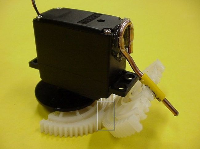 Серводвигатель нужно переделать таким образом, чтобы он работал только на вращение. Затем к нему надо приклеить медный провод, как указано на картинке.