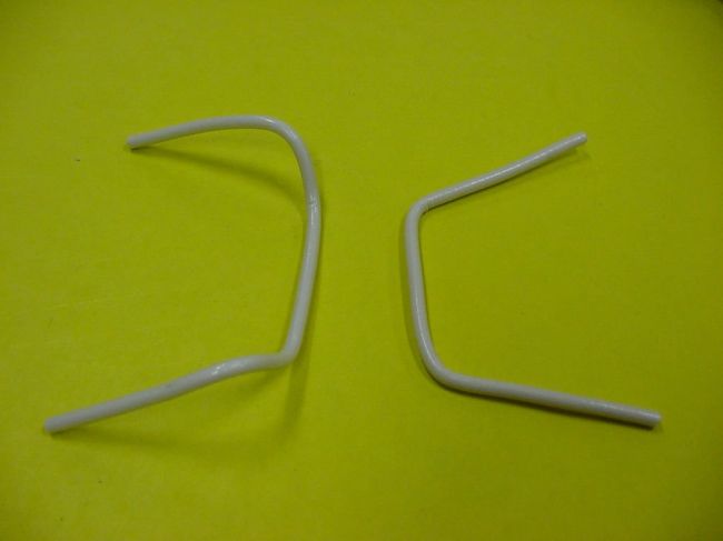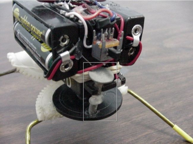 В качестве ног используется медная проволока, ее нужно согнуть так, как указано на картинке. Затем автор приклеивает лапы к полукругам. Также теперь можно приклеить к серводвигателю держатели батареек.