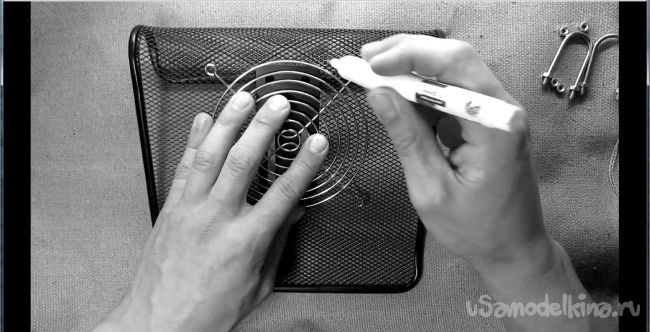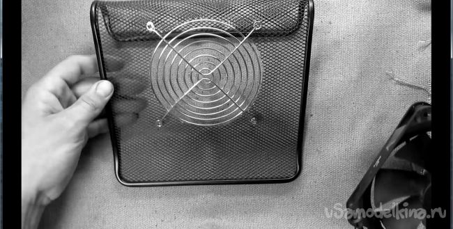 Закрепляем на подставке с помощью шурупов, кулер и декоративную решетку.