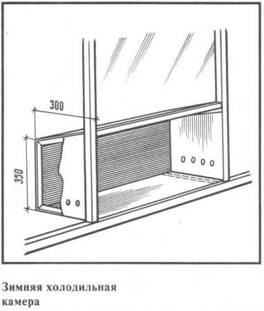 Для вентиляции в боковых стенках камеры сверлят отверстия, диаметр которых исключает возможность проникновения внутрь «помещения» птиц. Если холодильная камера расположена на солнечной стороне, то ее стенки целесообразно изолировать пенопластом. От помещения лоджии холодильная камера изолируется фрамугой или дверкой. Такая камера принимает температуру наружного воздуха и в холодный период достаточно надежно обеспечивает сохранность скоропортящихся продуктов. Кстати, если у вас нет лоджии, такую камеру можно установить и в кухонном окне.
