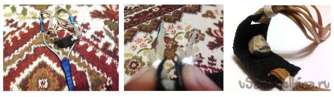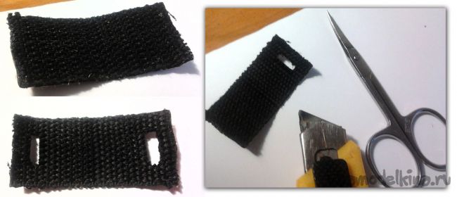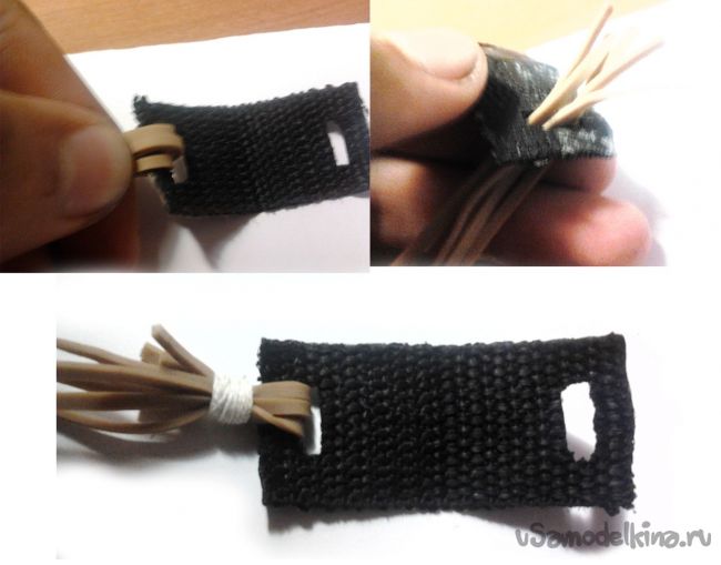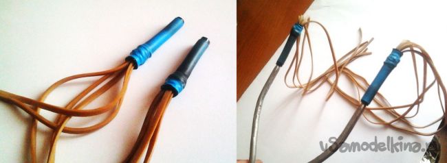 Еще удобно стрелять из нейлоновых кожетков, которые при опаливании не разлезаются (из такого материала обычно делаются лямки рюкзака). Чтоб прикрепить метательную резину просуньте один конец через отверстие и хорошенько завяжите это дело капроновой нитью.