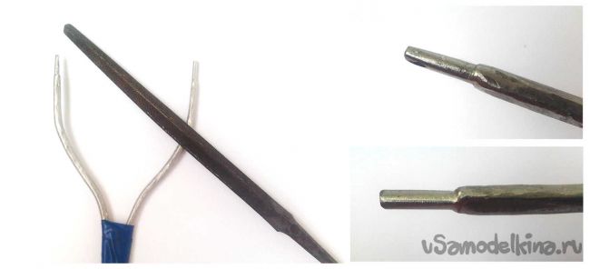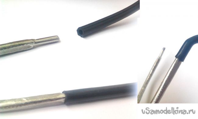(для меня это изоляция с толстого провода) и чтобы натянуть её мною были обработаны концы напильником, не переусердствуйте, нужно сделать такой диаметр, при котором изоляция насаживается с силой, и крепко держится без дополнительных крепежей. Это же возможно сделать абразивным камнем, делаем гладкие края, чтобы резина не рвалась. Нанизываем два кусочка длинной несколько сантиметров на концы. Для большей надежности можно предварительно нанести немного клея.