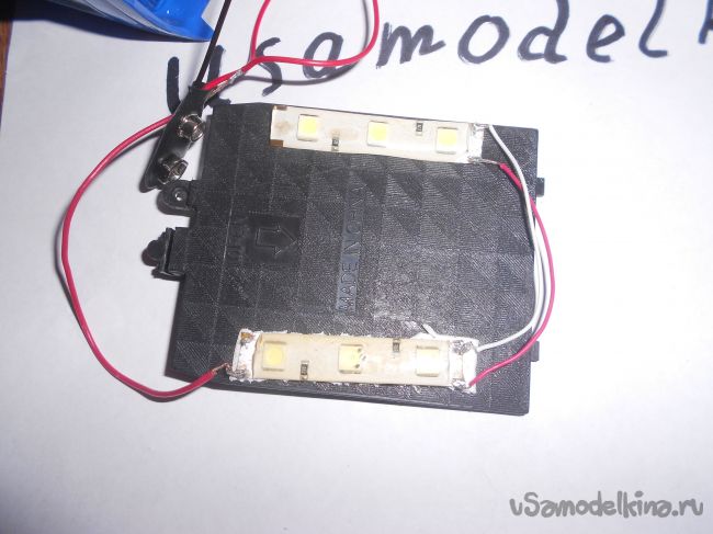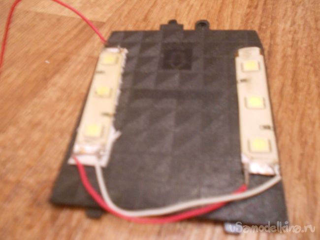 4. После этого кусочки светодиодной ленты располагаем по краям крышки от питания радиоуправляемой машинки и отмеряем длину проводов чтобы соединить эти кусочки.