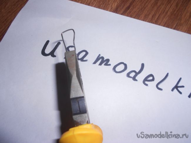 7. Выключатель в корпусе. Теперь самое опасное: (соблюдайте меры предосторожности!!). Лично я подстелил железный лист, одел перчатки и очки. Нам предстоит выпрямить скрепку и согнуть ее буквой «п».Берем пассатижи и зажимаем скрепку.